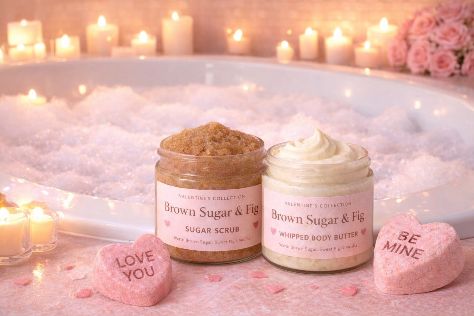 Our Valentine’s Duo features the dreamiest Brown Sugar & Fig scrub and whipped body butter and candy heart bath bombs, the perfect recipe for the ultimate cozy skincare moment. Valentin's Collection Will be added to the website for purchase